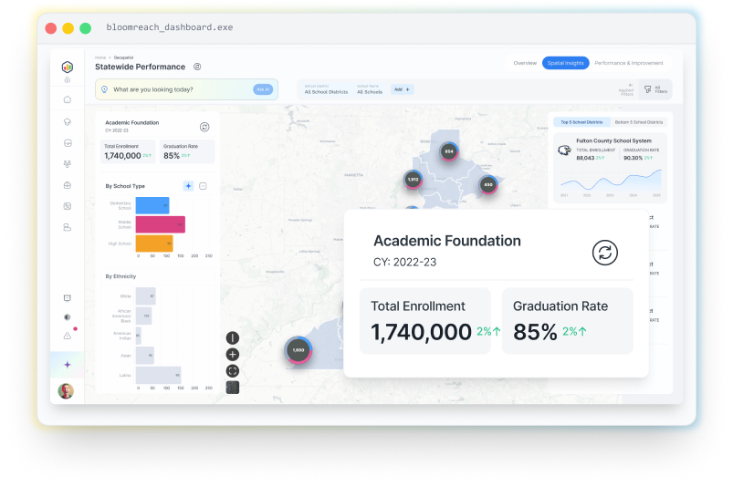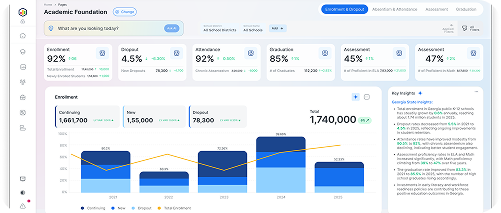 StateEd360 integrates district data into a unified oversight model. Dashboards surface comparisons, trends, and early signals while maintaining consistent definitions and governance. AI-driven insights enhance visibility into at-risk districts, enabling oversight teams to take action early. Role-based access ensures teams see only what they need, while shared metrics keep communication aligned across regions.