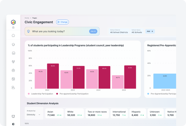 With built-in AI capabilities and role-based access, StateEd360 makes it easy for decision-makers to spot trends, identify gaps, and align resources. Whether you’re at the department level or in the governor’s office, our unified data model enables clarity across all educational pillars.