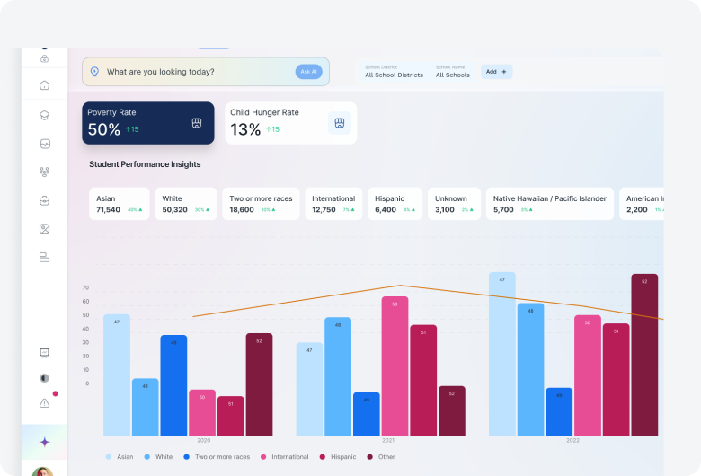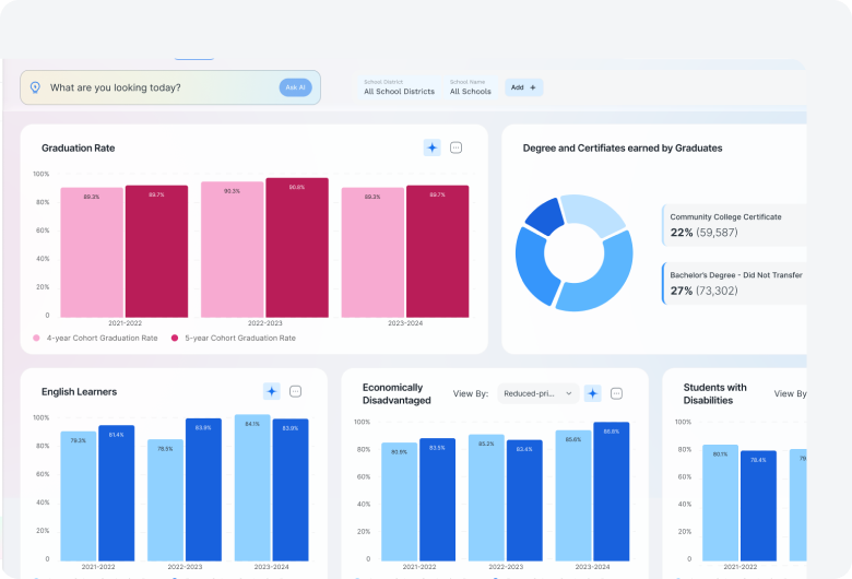 Experience how your state can unlock unified, real-time education insights with AI-powered dashboards. Our team will walk you through how StateEd360 helps leaders drive impact, align agencies, and support strategic decision-making across K–12.